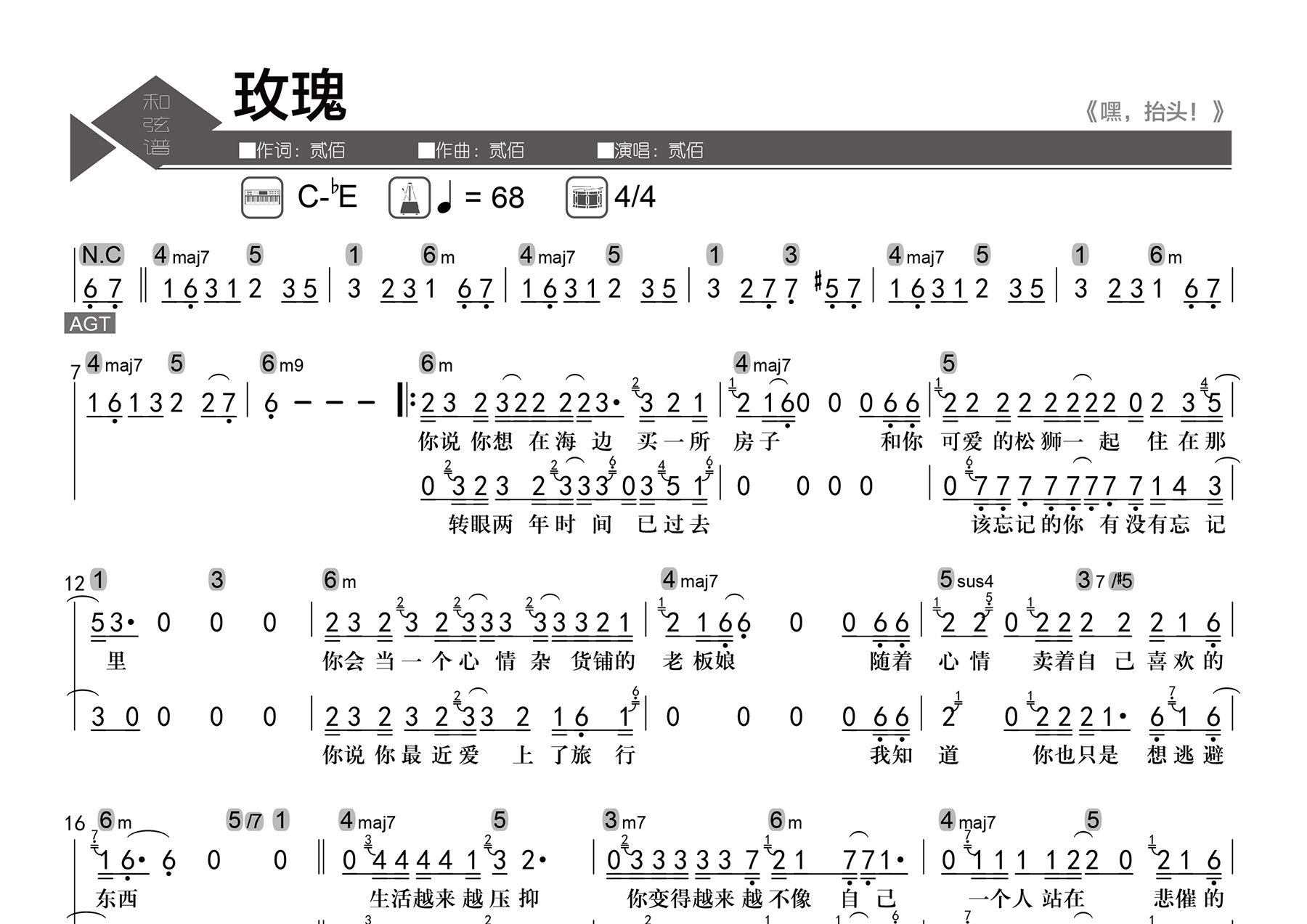 【歌曲信息】Key:C-bE Tempo:4/4 每分钟68拍。